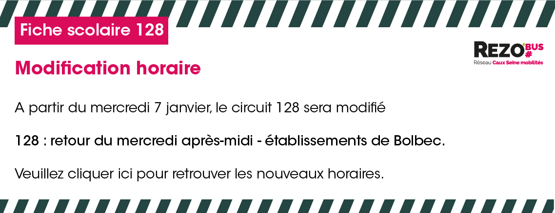 📅 A partir de mercredi 7 janvier, le circuit 128 (Retour du mercredi après-midi) sera modifié.